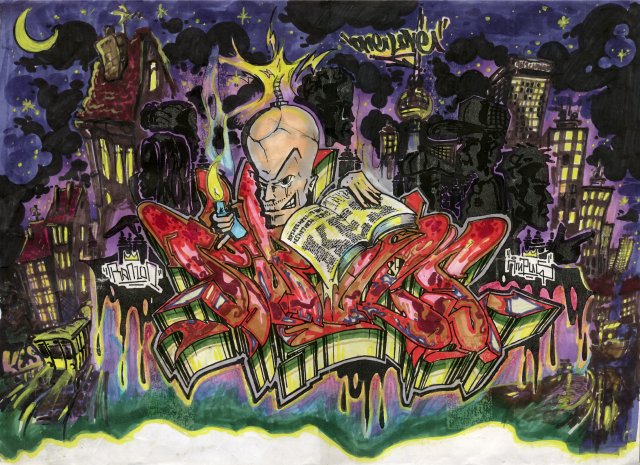 spraycan/​acrylic marker/​ink/​chalk marker/​spit on plywood, 41x60cm, 2017