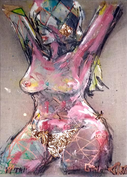spraycan/​acrylic/​marker/​gold foil on canvas, 50x70cm, 2017